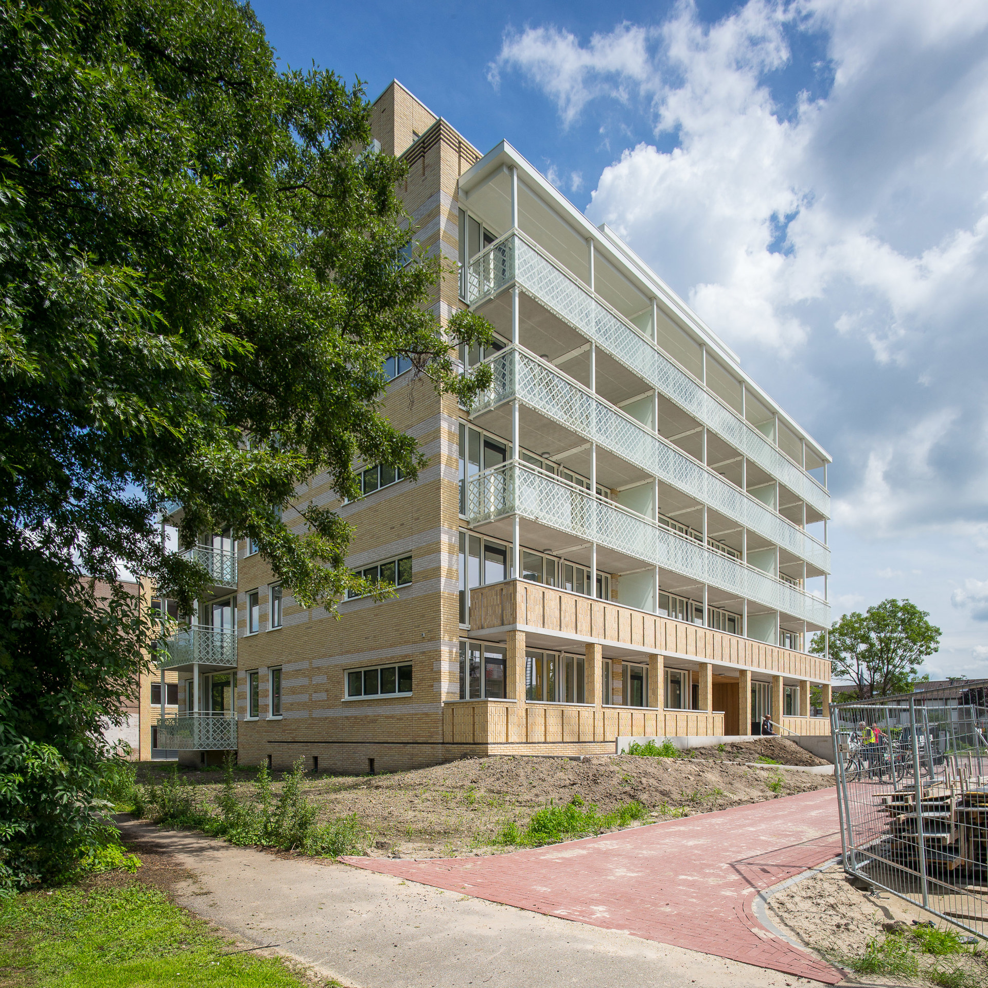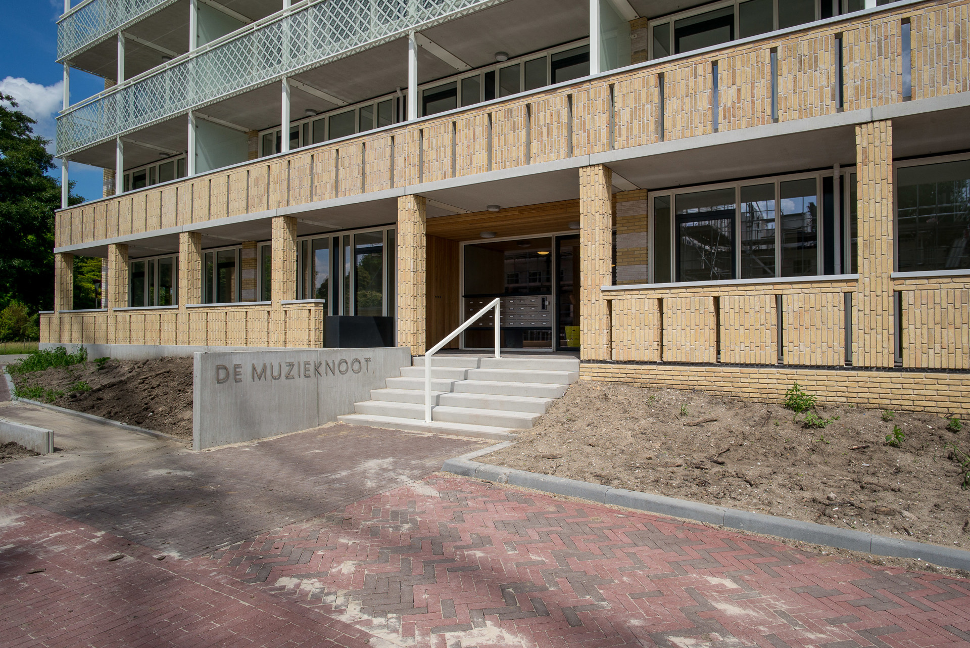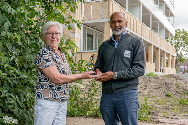 Mevrouw De Kuijper kreeg uit handen van buurtbeheerder Kewal Krishan de (muziek)sleutel uitgereikt. ‘Ik voel me bevoorrecht dat ik in zo’n mooi ontworpen gebouw mag wonen. De architectuur is zo verrassend, de kleuren, de vormen en de gekozen materialen zoals het hout in de hal. Het meeste kijk ik uit naar het gemak van een gelijkvloerse woning. Maar ook de kleinschalige opzet van het gebouw spreekt mij enorm aan. Ik kijk er naar uit om mijn nieuwe buren te leren kennen.’