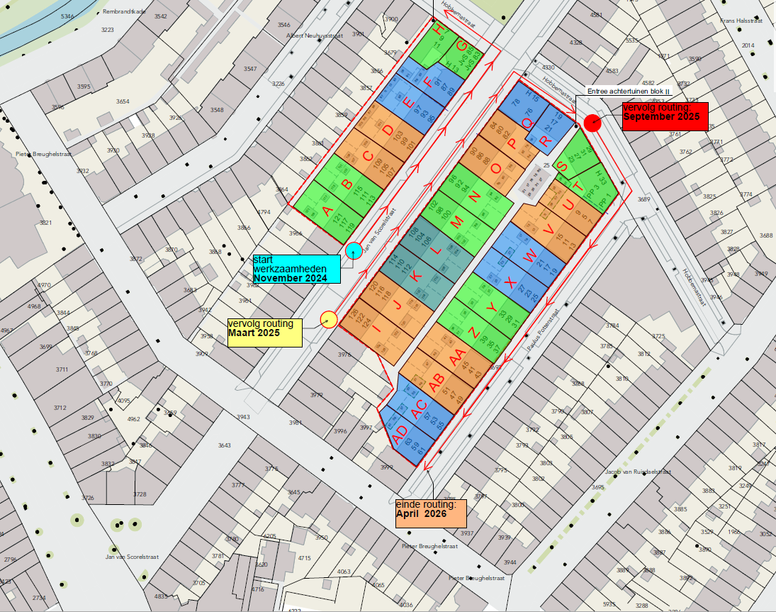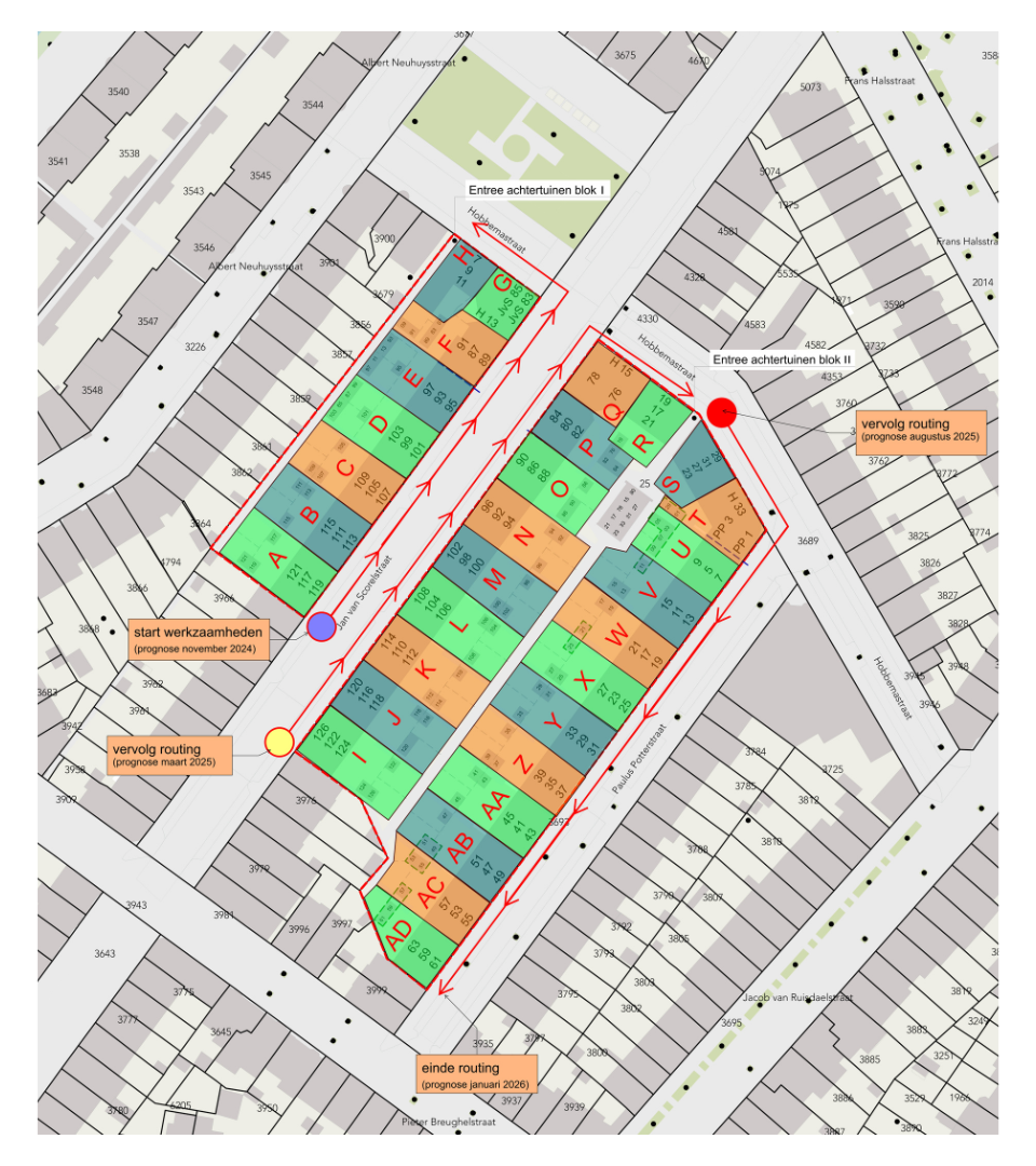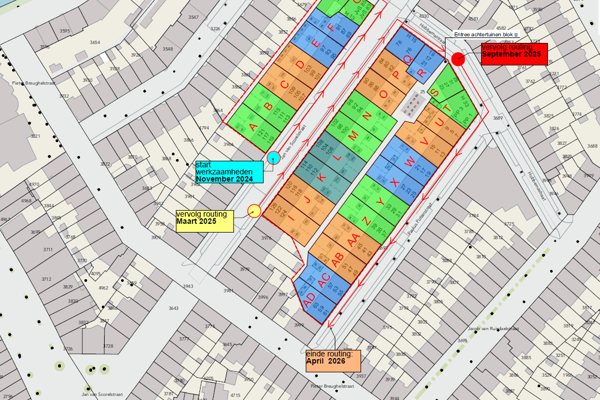 Aannemer Heilijgers start in november 2024 met de uitvoering van het werk. In onderstaande plattegrond ziet u de volgorde. Naar verwachting ronden we het werk in april 2026 af.