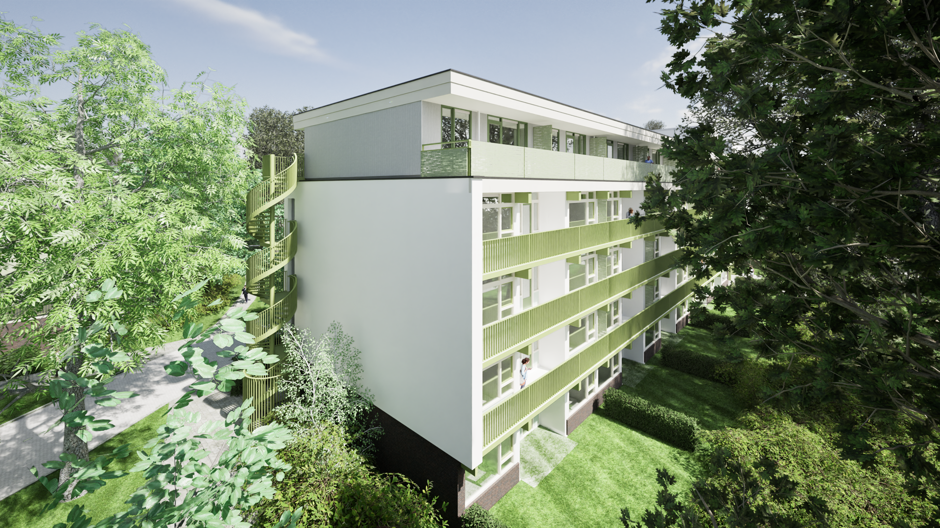 - We op deze vier flats één woonlaag toevoegen (lage gedeelte) waardoor er 32 nieuwe woningen worden toegevoegd (8 per flat).