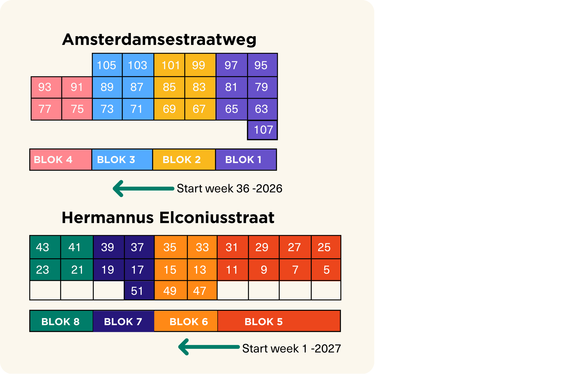 * en maakt u indien van toepassing de keuzes voor de nieuwe keuken, badkamer en toilet. - September 2026: Start met het werk in het eerste blok, aan de Amsterdamsestraatweg.