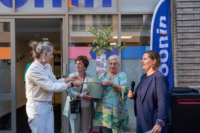 Kyra Geertsema, teammanager Wonen Oost, overhandigde een symbolisch boompje aan twee bewoners. Ter ere van het nieuwe kantoor plant Woonin twee bomen in Overvecht. De bomen staan symbool voor de Woonin-wortels in de wijk en voor een bloeiende wijk.