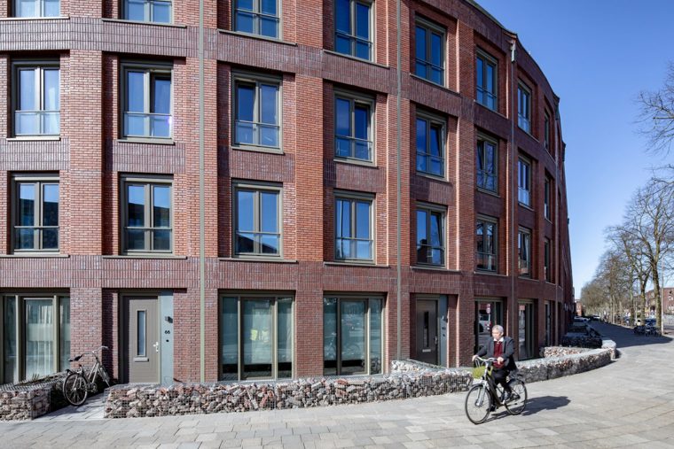 En dan het ontwerp. Dat moest aansluiten op projecten die we eerder in deze buurt hebben gedaan. De gemeente stelde eisen aan de gevel: we moesten bijvoorbeeld gebruikmaken van een bepaalde steensoort en de ronding uit een van de oude gebouwen moest terugkomen in het nieuwe gebouw. Ook vangen we het regenwater van de daken op in wadi's in de binnentuinen, waardoor het water geleidelijk wegloopt in de grond. Daarnaast hebben we veel aandacht gegeven aan circulariteit. Zo zijn oude bakstenen hergebruikt in de schanskorven voor het gebouw en is de gevelbekleding gemaakt van rijstvlies. Architectenbureau LEVS heeft alle voorwaarden meegenomen in het uiteindelijke ontwerp. We zijn erg tevreden met het eindresultaat!”