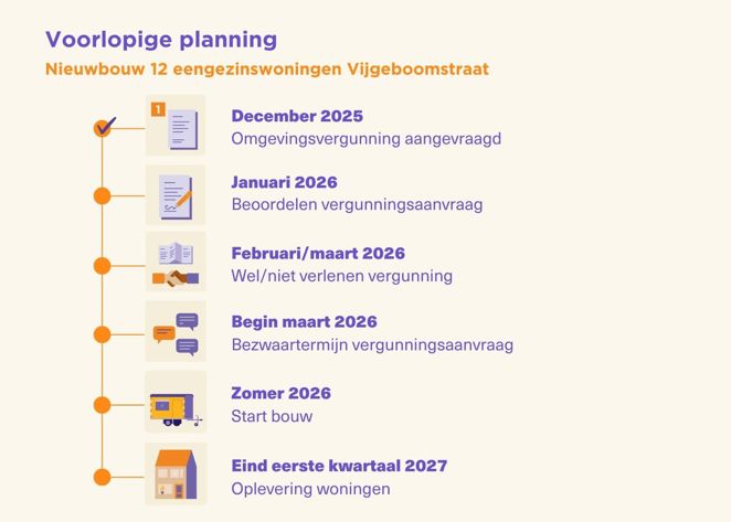 Woonin heeft de vergunning aangevraagd voor de bouw van 12 middenhuur eengezinswoningen in de Vijgeboomstraat. De 12 eengezinswoningen worden gebouwd met houten wanden en vloeren van Cross Laminated Timber (CLT). Dit is een sterke houtsoort die bestaat uit meerdere lagen. CLT is een duurzaam en circulair materiaal en beter voor het milieu. Het hout slaat CO₂ op en draagt zo bij aan een prettig woonklimaat.