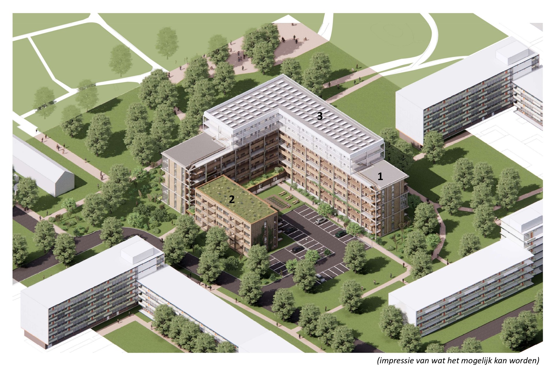 Het plan voor de nieuwbouw is klaar. Bewoners en omwonenden konden meedenken over het nieuwbouwontwerp. De buurt vond het belangrijk dat het nieuwe gebouw goed aansluit bij de omgeving. Het gebouw wordt in een U-vorm gebouwd, waarbij in het midden een open ruimte ontstaat met plek voor groen en parkeren. Aan de kanten van de bestaande bebouwing is de nieuwbouw vier woonlagen hoog. Terwijl het gebouw aan de parkzijde tot acht woonlagen gaat.