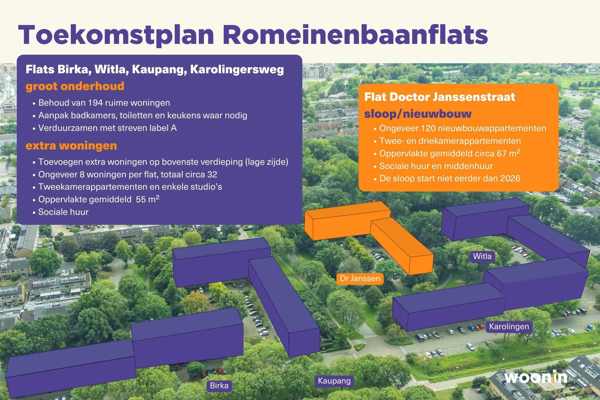 Woonin gaat groot onderhoud met verbeteringen uitvoeren aan vier van de vijf Romeinenbaanflats: Karolinger, Witla, Kaupang en Birka. Het plan houdt in dat: